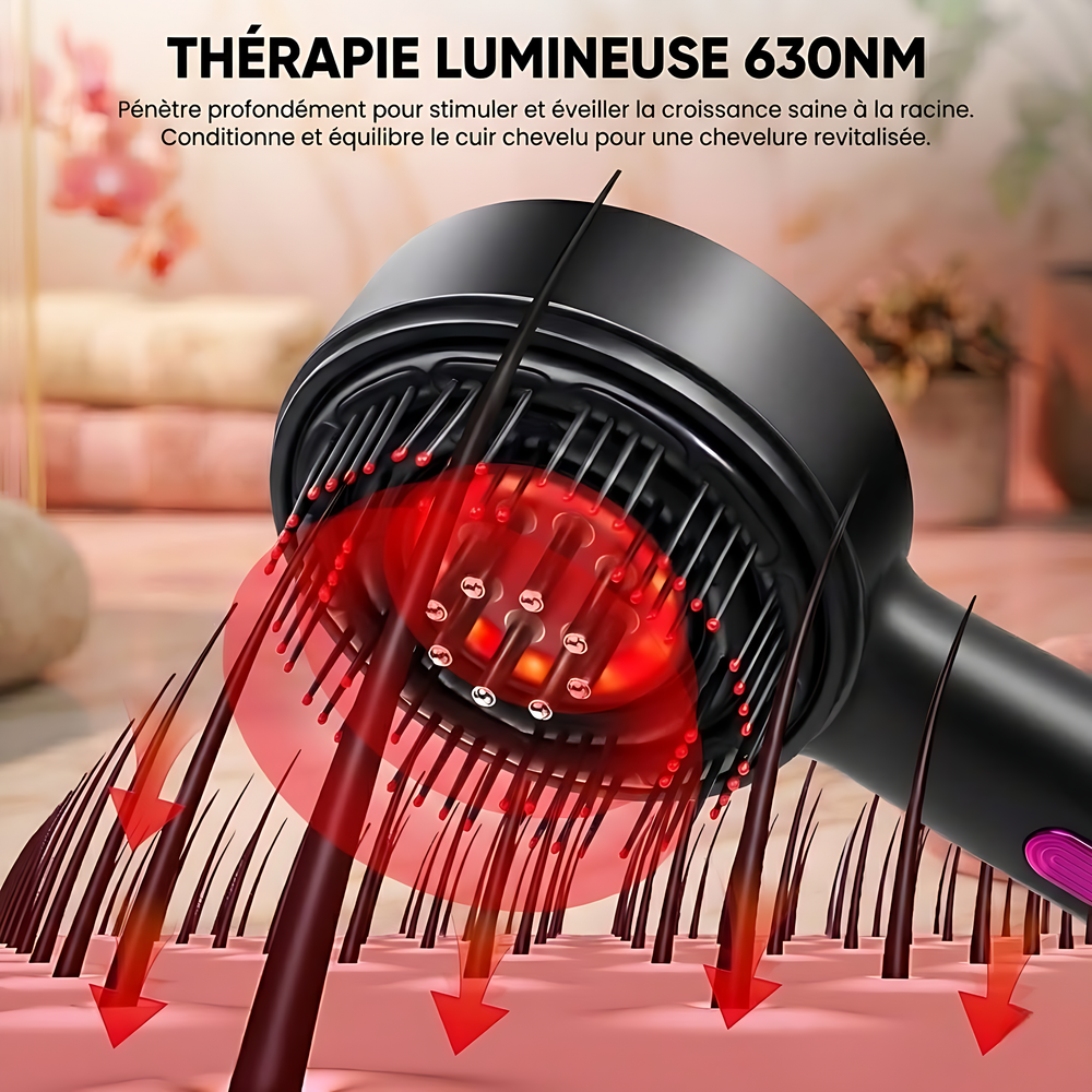 Elle associe massage mécanique, diffusion contrôlée des liquides et stimulation lumineuse pour une action ciblée à la racine.